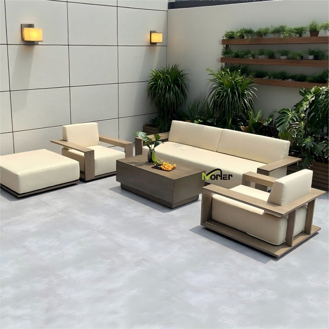 5. Sofá de teca para exterior: Feito de teca natural altamente resistente às intempéries, este sofá possui grãos finos, alta estabilidade e desenvolve uma sensação mais luxuosa com o uso, tornando-o uma escolha clássica para criar uma varanda estilo resort de alta qualidade.