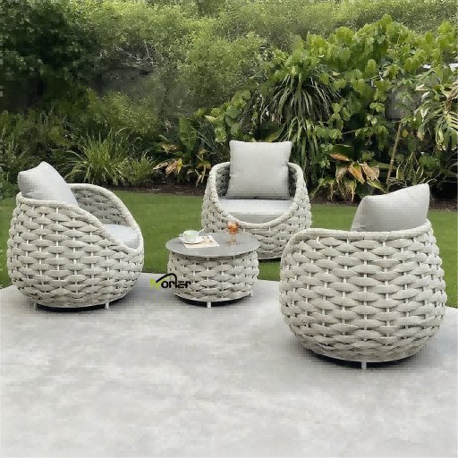 4. Sofá externo em corda: o design da corda trançada à mão é visualmente leve e respirável, e a moldura de alumínio adiciona um toque moderno. Combinando conforto e arte, é uma escolha popular para criar uma varanda sofisticada.