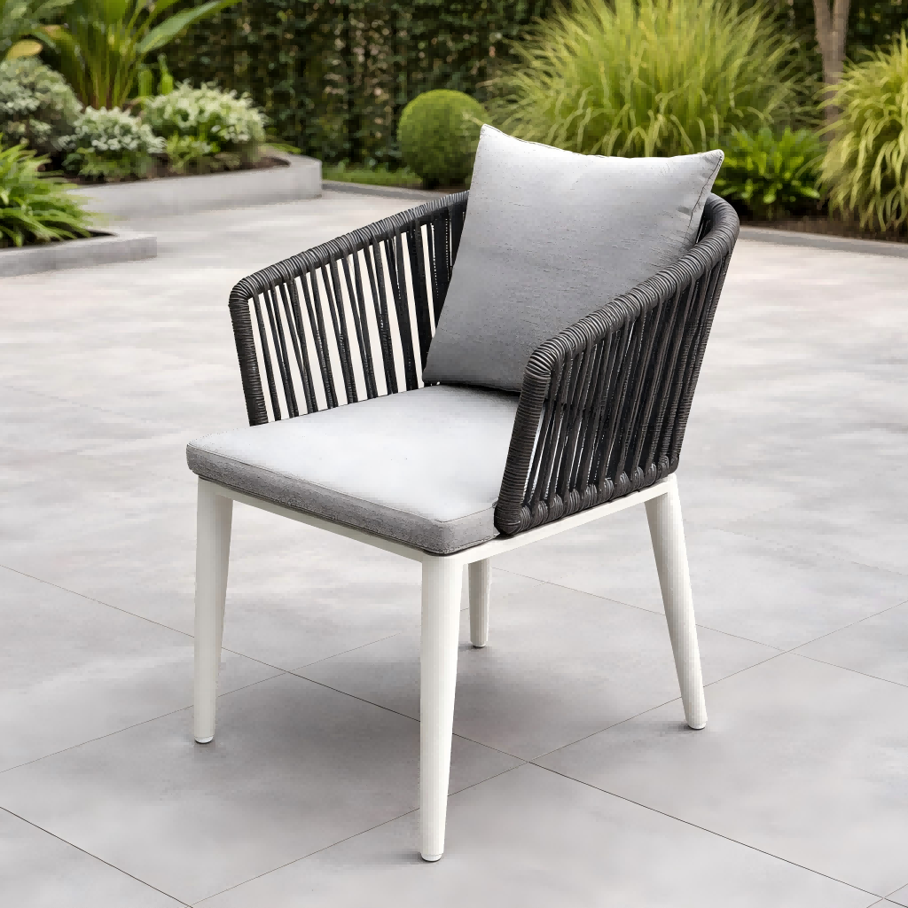 As cadeiras de jantar apresentam encosto tecido em corda, criando uma aparência moderna e elegante, ao mesmo tempo que proporcionam um suporte confortável. A estrutura é feita de alumínio com revestimento em pó, que oferece excelente resistência à ferrugem e às intempéries externas.